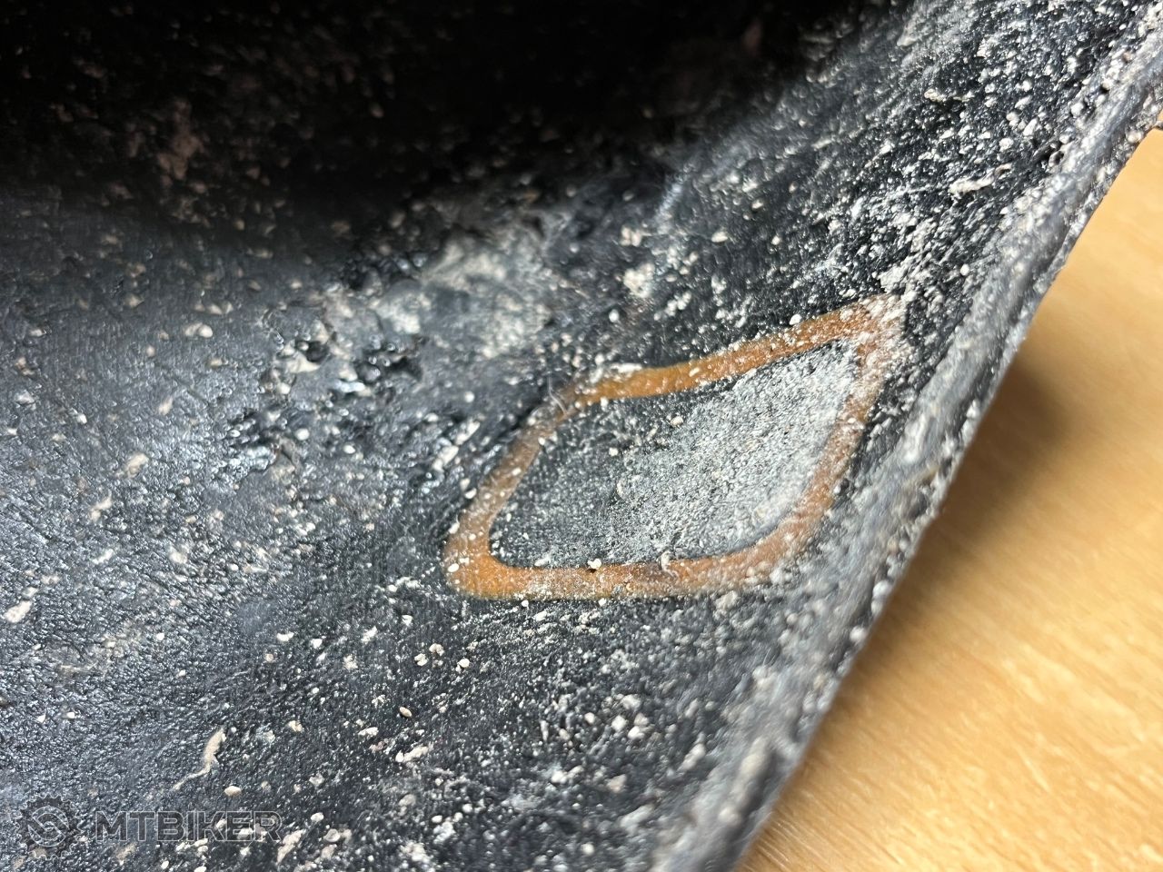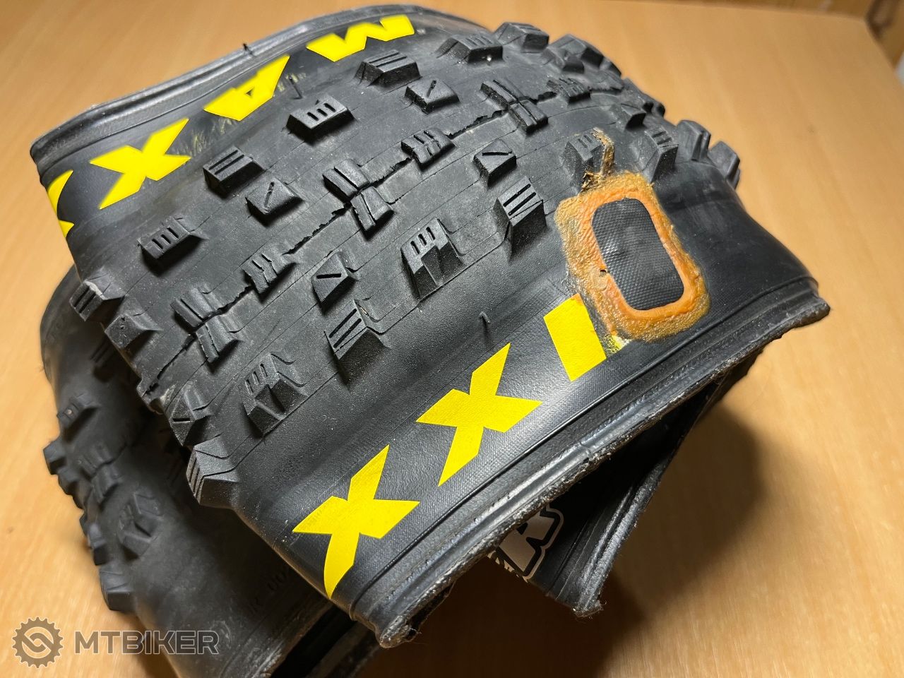 Jazdené, málo opotrebené, predný dezén 3,2mm (25€), zadný seknutý, opravený (záplata na fotke je iba kvôli ochrane švov, z vnútra je ďalšia), z dlhodobého hľadiska stratí tlak skôr ako predný, malo by to urobiť mlieko zo začiatku držal spoľahlivo, inak som ho úplne normálne jazdil, sekol som ho totiž na prvom výjazde, dezén 2,9mm (15€),